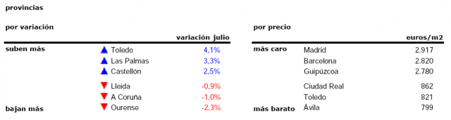 El ranking de las provincias más caras sigue encabezado por las provincias vascas de Guipúzcoa y Vizcaya, con 2.942 euros/m2 y 2.636 euros/m2, respectivamente, tras las que se sitúan Madrid (2.373 euros/m2) y Barcelona (2.154 euros/m2). Lleida es la provincia más económica (862 euros/m2), seguida por Toledo (867 euros/m2) y Cuenca (896 euros/m2).
