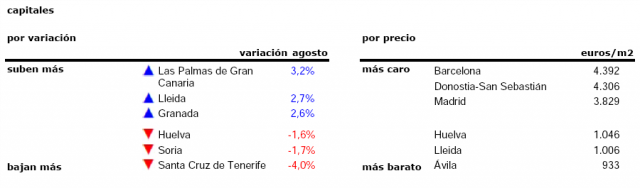 San Sebastián se consolida como la capital española más cara (3.842 euros/m2), seguida de Barcelona (3.392 euros/m2) y Madrid (2.820 euros/m2). En cuarto lugar se sitúa Bilbao con un precio de 2.759 euros por cada metro cuadrado. En la parte opuesta de la tabla encontramos a Lleida, la capital más económica, con un precio de 822 euros/m2 y la única por debajo de los mil euros el metro cuadrado.
