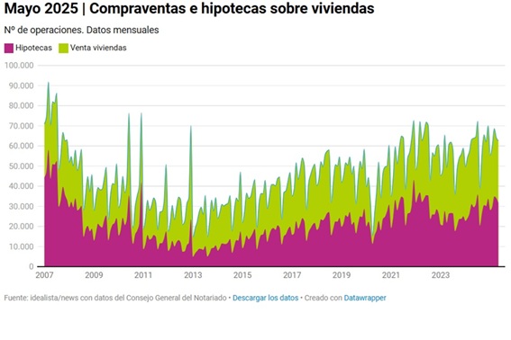 La compraventa de viviendas cayó un 2% en mayo en comparación al mismo mes del año anterior, hasta las 62.587 unidades. Se trata de la primera caída interanual desde marzo de 2024, cuando registró un descenso del 12,4%. Y la concesión de préstamos hipotecarios para adquisición de vivienda aumentó un 7,4% en tasa interanual, hasta las 31.723 operaciones, según datos del Consejo General del Notariado.