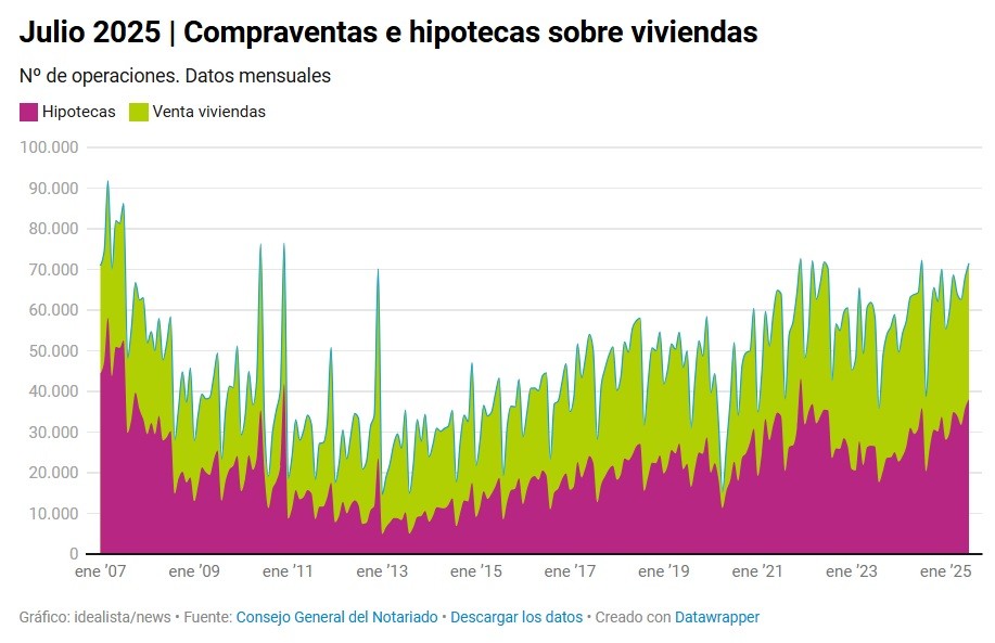 Las ventas de viviendas se han anotado su segunda caída interanual en los últimos tres meses (bajaron un 1,7% en mayo, con su primer retroceso en 14 meses). A pesar del descenso interanual de julio, el volumen de compraventas es el más alto en lo que va de año y el tercero más destacado de los últimos 12 meses (solo superado por julio y diciembre de 2024). De hecho, en el acumulado entre enero y julio las compraventas superan las 451.000 unidades, con un alza del 6,25% respecto al año pasado.