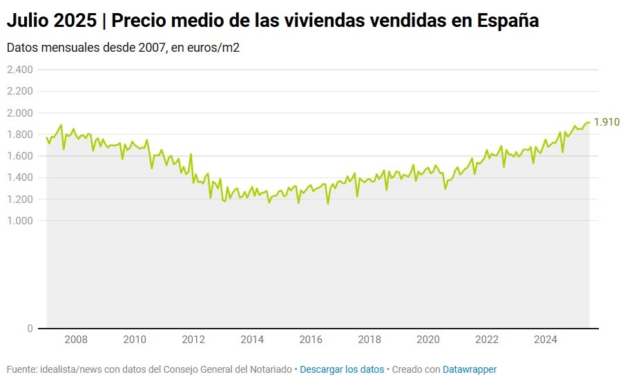 Lo que ha vuelto a crecer en julio es el precio medio de las viviendas vendidas, que se ha incrementado un 4,9% interanual, hasta alcanzar los 1.910 euros/m2. Ya acumula 24 meses consecutivos de subidas interanuales y marca un nuevo máximo histórico.